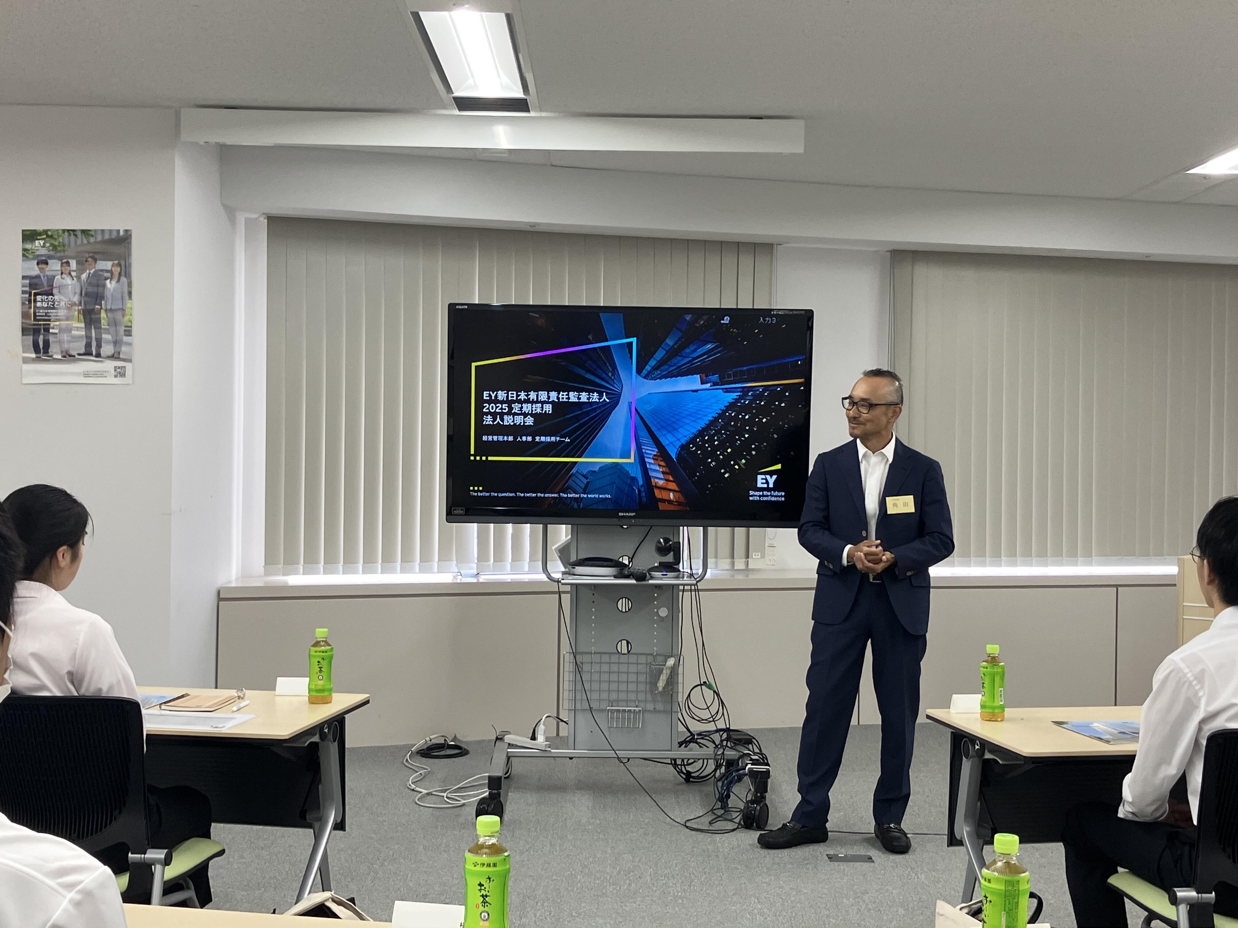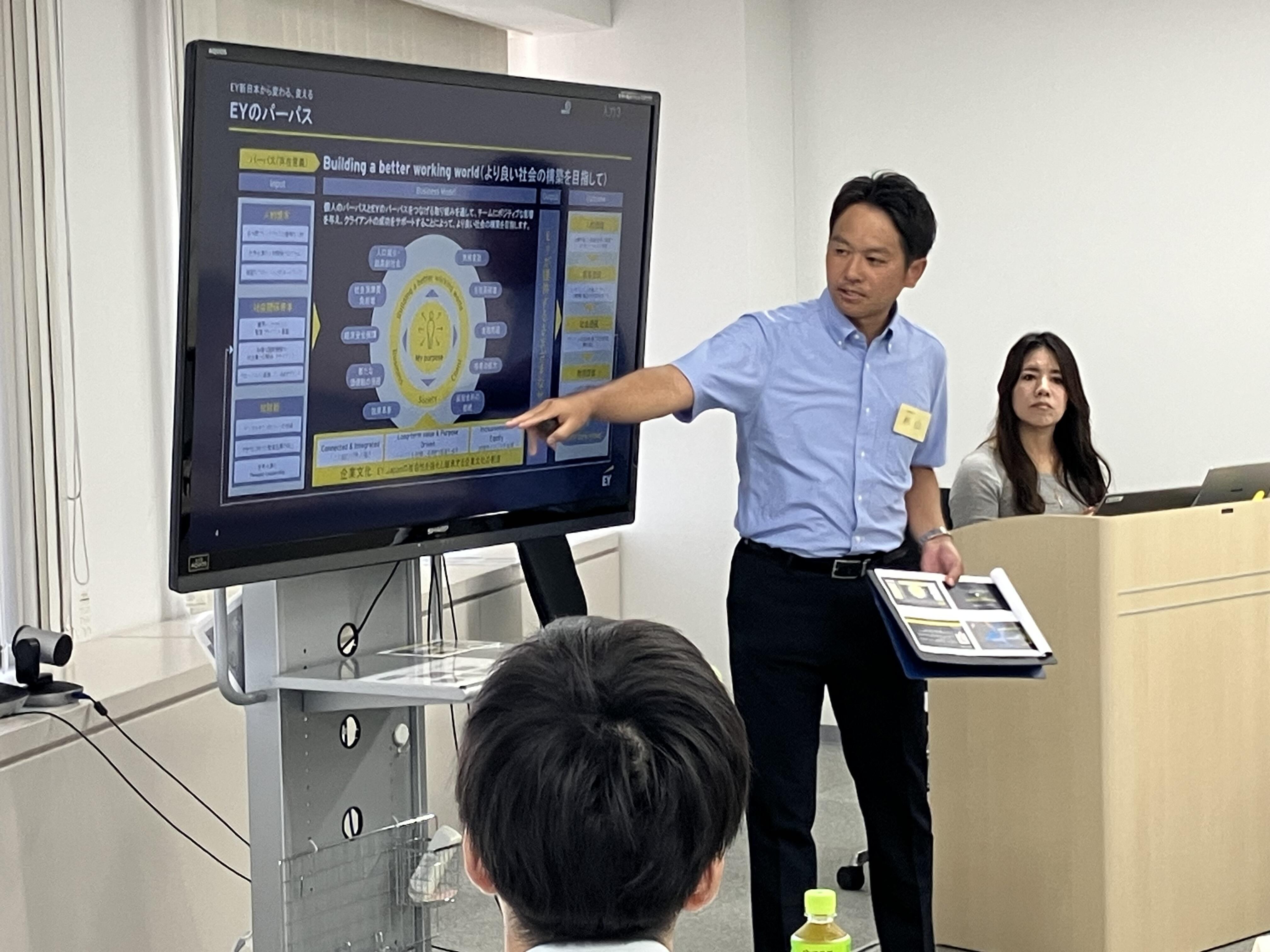 リクルート担当パートナーから、自身の就職活動時代を振り返りながら、法人の魅力、そしてEY浜松・静岡事務所で働くことの意義を、皆さんにお伝えしました。